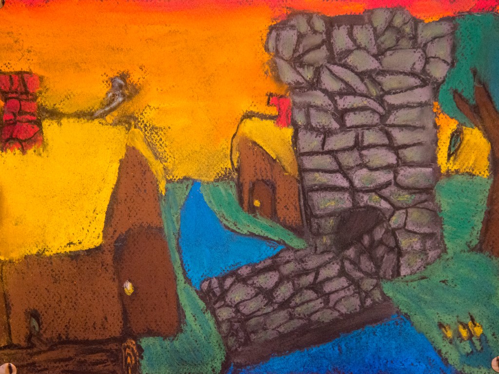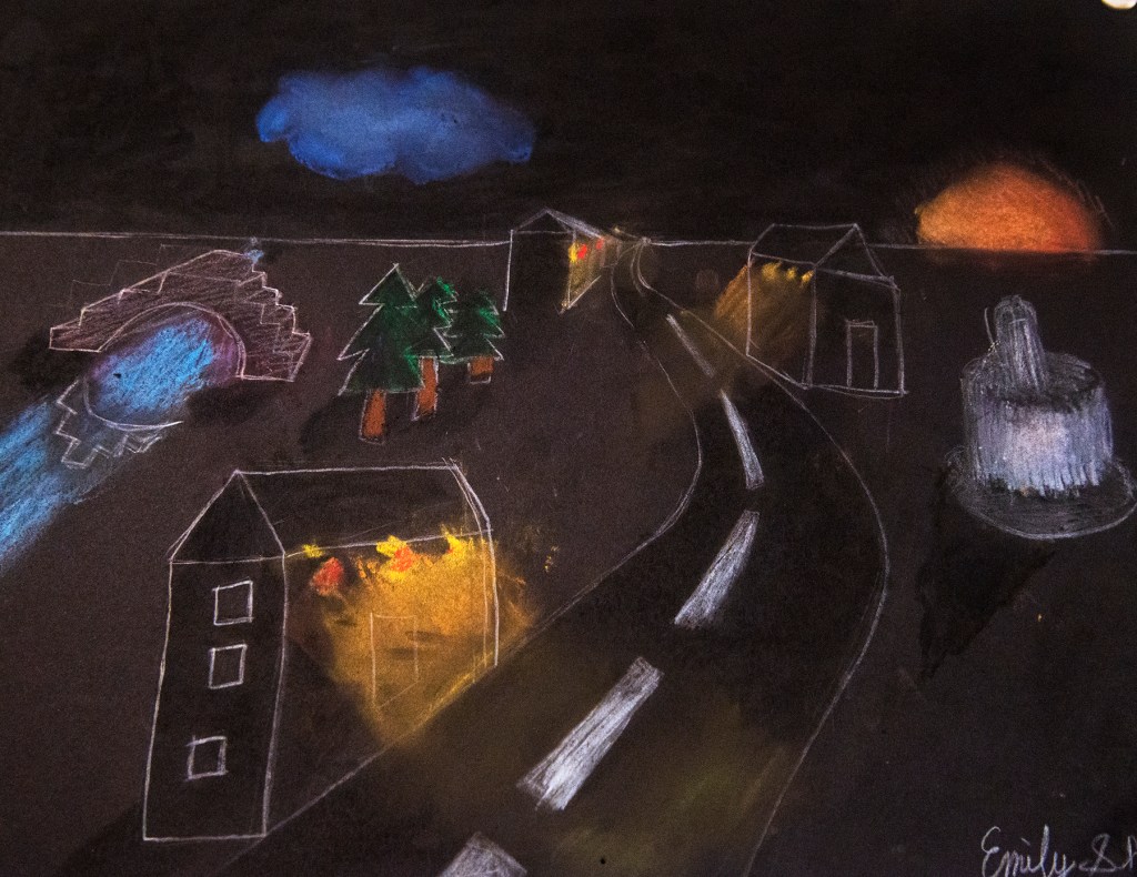 As objects recede in space, they become smaller to our eye, and eventually meet at a point. A horizon line meets at a vanishing point to separate sky and ground. Students will observe different examples of cities one-point perspective to begin to get a sense for how we perceive things up close and at a distance, as well as to learn to identify whether the perspective is high (“bird’s eye view”) at eye-level, or low (Cat’s eye view”). Additionally, students are challenged with expressing the qualities of color and light at night.
