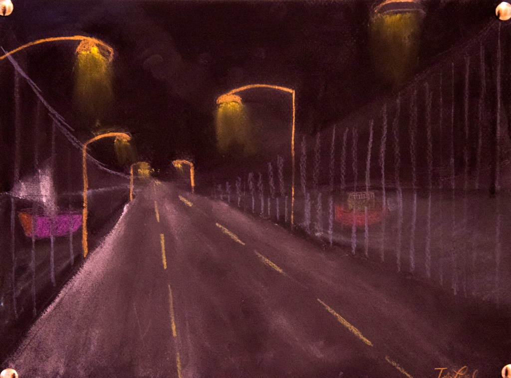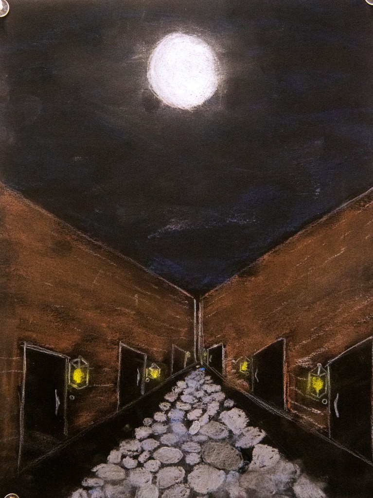 Students create a basic nighttime one-point perspective drawing that includes a vanishing point and a horizon line.