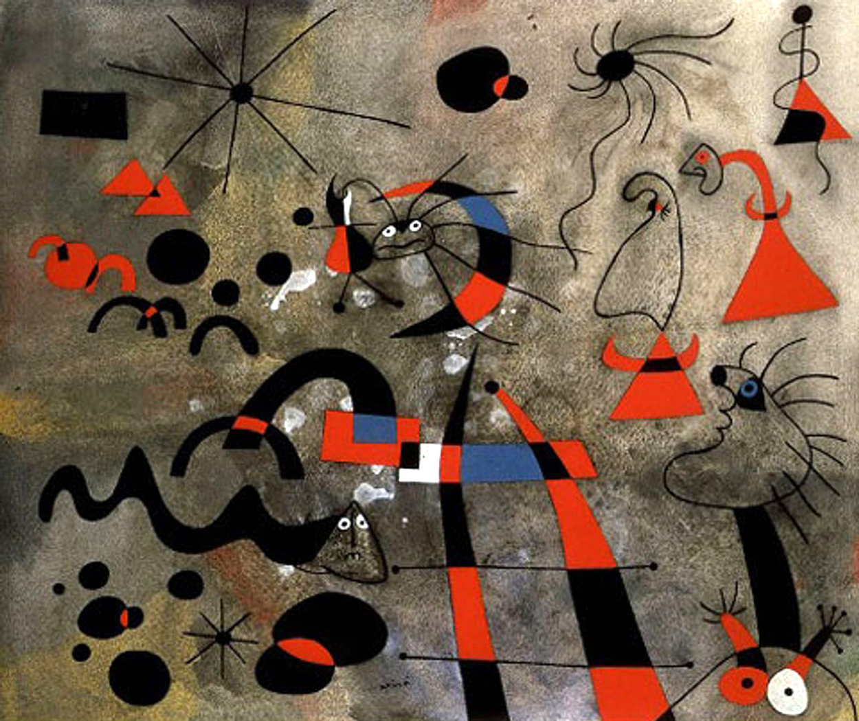 Joan Miró (1893-1983), a lighthearted, humorous, yet thoughtfully provocative artist, carved his own surrealist path, balancing spontaneity and automatism with meticulous planning and rendering (source: https://www.theartstory.org/artist-miro-joan.htm). He worked with limited palettes, combining muted backgrounds with mostly single-lined, bold, expressive color (however sparingly) and imagery in the foreground.