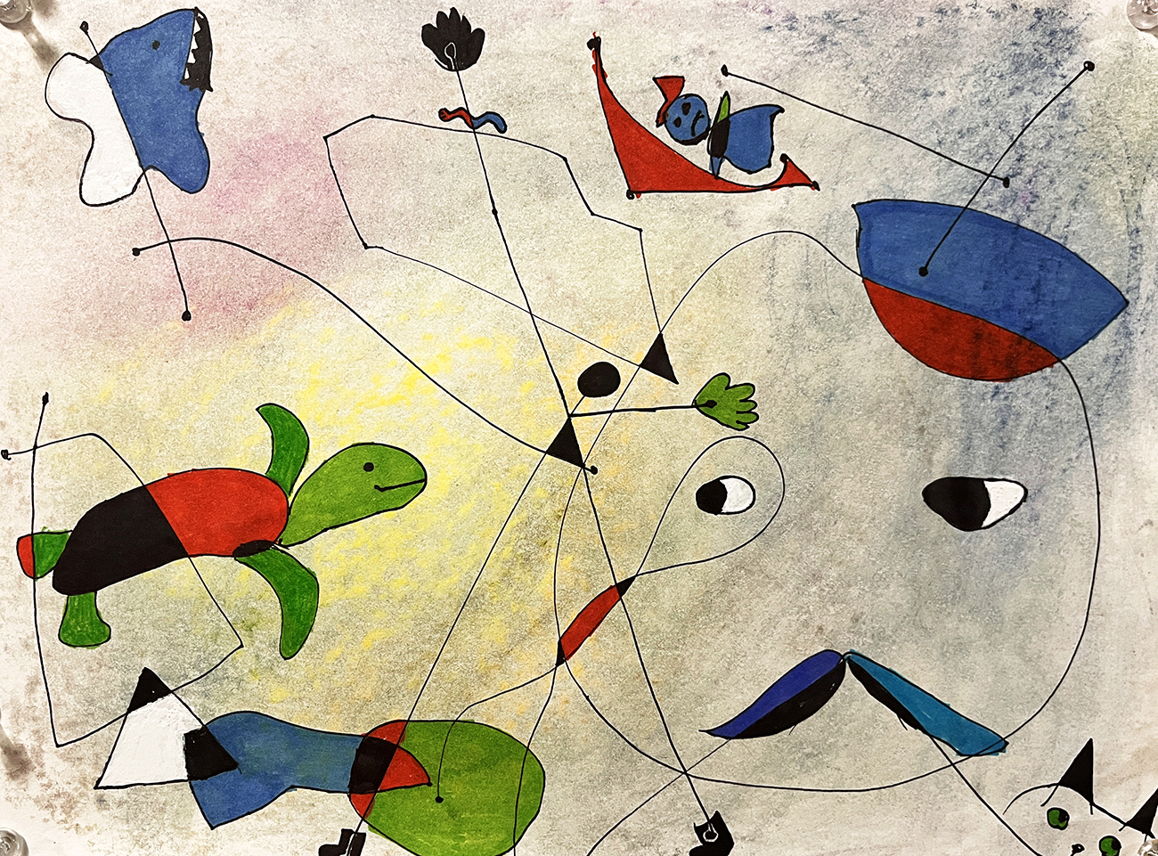 Students pay specific attention to his use of both organic and geometric lines and shapes; the contrast between the muted, soft background colors versus the pure, bold blocks of color in the foreground, with the very deliberate use of black and white for contrast; they discuss the silly little creatures they find sprinkled throughout his compositions, lightheartedly arguing over what it is they see, illustrating the magic of Miró’s work. Students will often mention the terms surrealism and abstraction to describe Miró’s work.