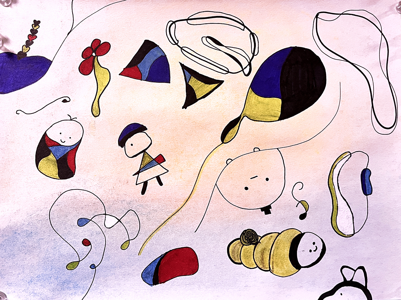 Students discovered the work of Joan Miró (1893-1983), a modern artist who blended thoughtful, “high art” concepts with spontaneous, playful designs that captured the imagination and challenged then-current notions of what constituted “good” art. A Miró tableau employed a muted, sparsely colored background with childlike doodles, geometric shapes and blocks of mostly primary color as foreground.