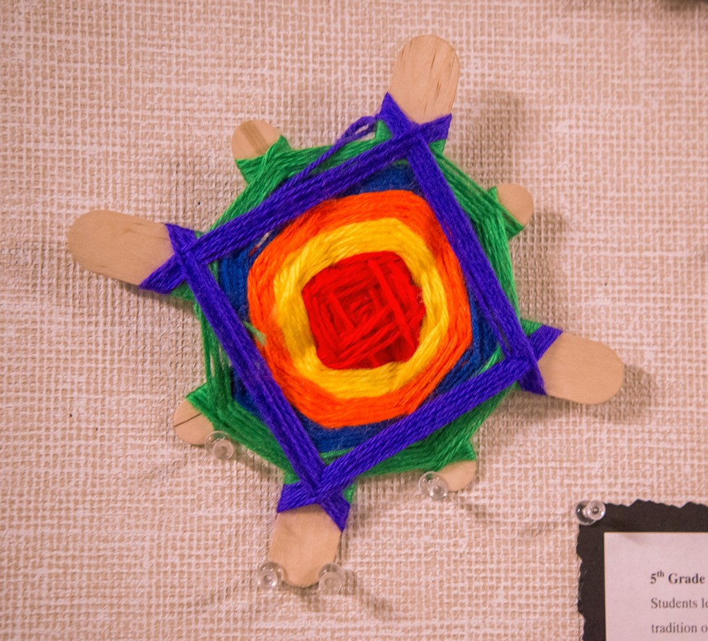 Upon the birth of a baby, Huichol (an indigenous Mexican group) parents weave a beautifully colored and elaborate “Ojo de Dios”, signifying health and protection throughout the child’s life. The child adds to this very Ojo de Dios with each new birthday starting at about age 5. Beginning with a simplified Huichol weaving style, students will create an Ojo de Dios, which will develop their hand-eye coordination and fine motor skills. With each new Ojo de Dios a student attempts, he/she will practice more complicated weaving techniques, create more elaborate color and shape designs, and improve their overall finished product.