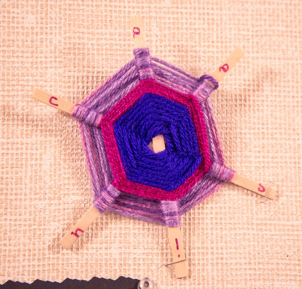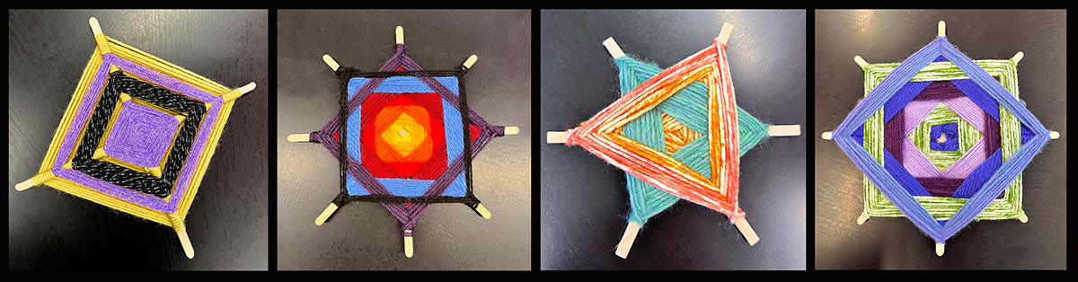 - Practicing weaving one four-pronged Ojo de Dios