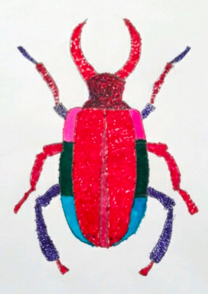 Now, how to introduce symmetry? I like to show the students photos of insects, asking them what they notice of each side of an insect’s body. As we talk about what we observe, I invite them to imagine what it would be like to draw a beetle or butterfly with dots, and how to make them symmetrical on both sides. You can’t imagine how excited the students get with the idea of this challenge. I invite them to consider ways to also include complementary colors side by side in their designs.