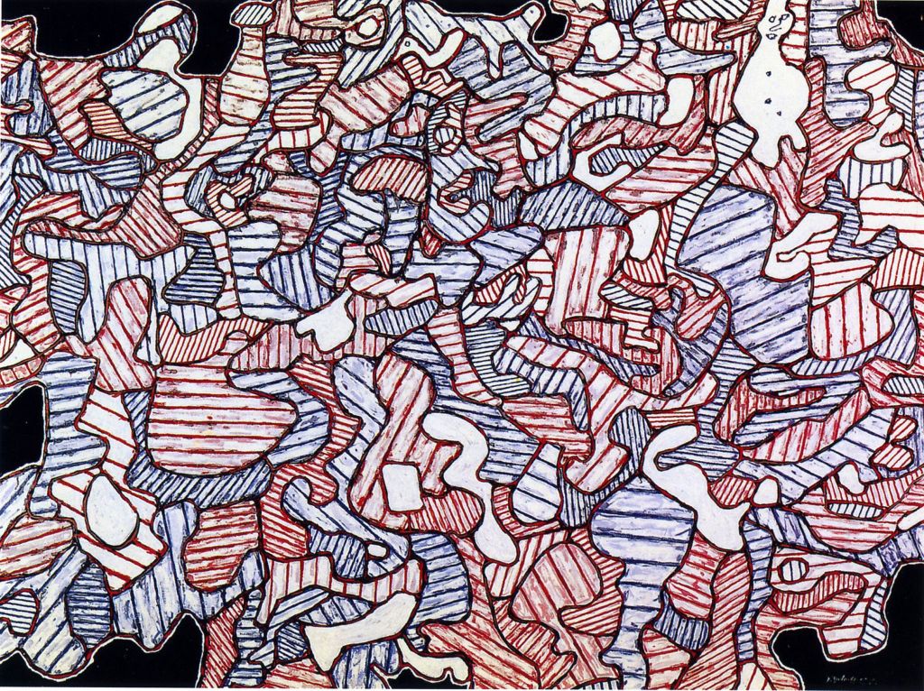 According to one of my favorite modern art history sites, the Art Story, “Dubuffet’s L’Hourloupe series began in 1962 and would preoccupy the artist for many decades. The inspiration came from a doodle he created while on the telephone, in which the fluid movement of line combines with limited fields of color to create movement. He believed the style evoked the manner in which objects appear in the mind,” (https://www.theartstory.org/artist/dubuffet-jean/artworks/#pnt_5).