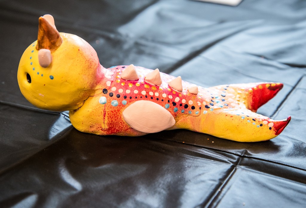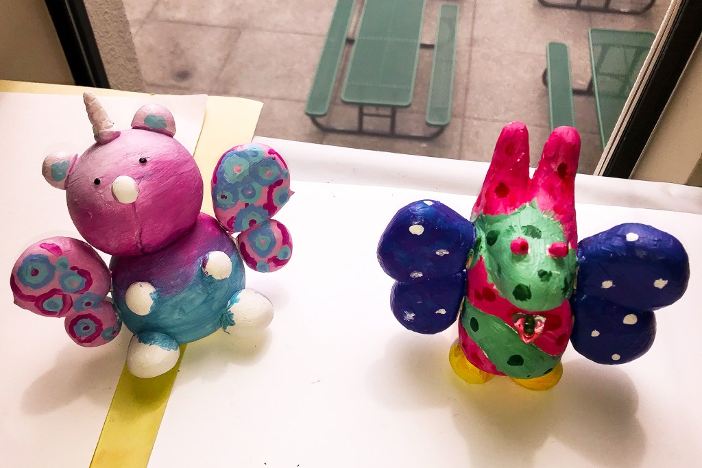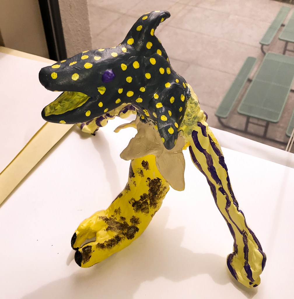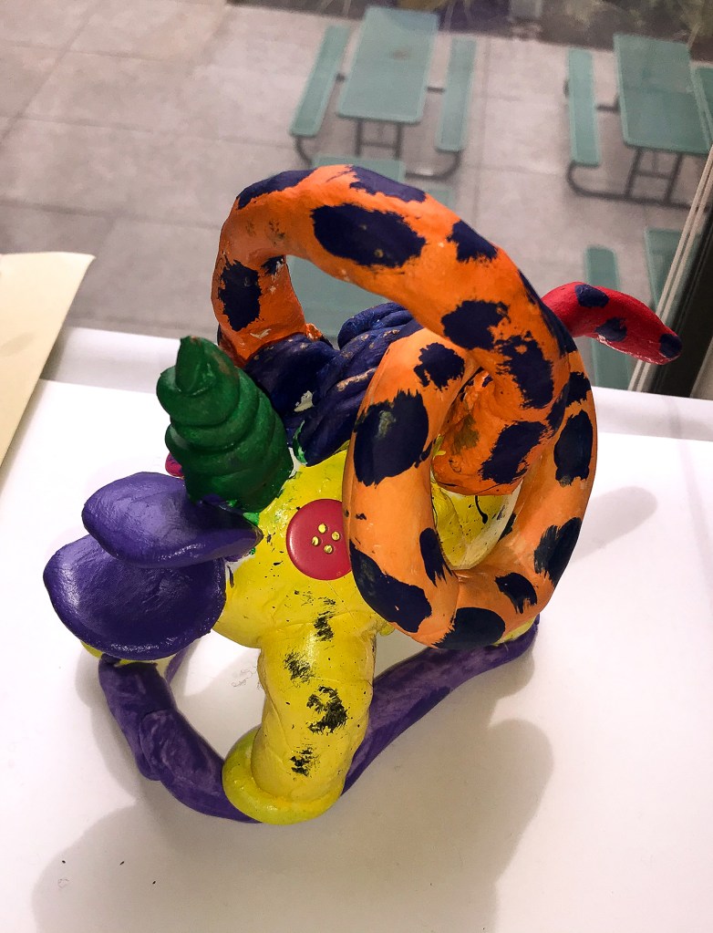 Students learned about Mexican artist Pedro Linares López and his fantastical, wild Alebrijes, imaginative and colorful papier-mâché creatures that Linares originated. Students created their own Alebrijes out of clay, paint and various objects.