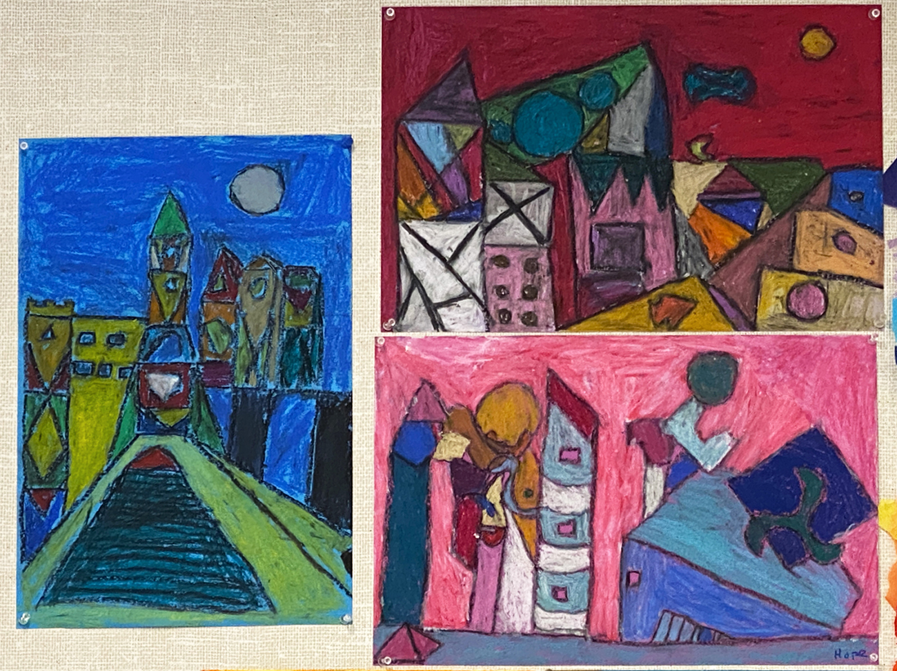 Two 3rd grade students’ oil pastel “cityscapes” inspired by Paul Klee’s magic square paintings