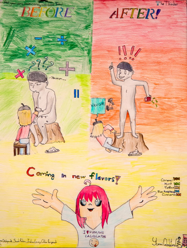5th grade art – usually groups try to keep their products a secret from other groups, but this group got wind of another doing an ad for gummi bears, and they decided to compete. Which do you prefer, this one, or the one a couple of images up? Why?