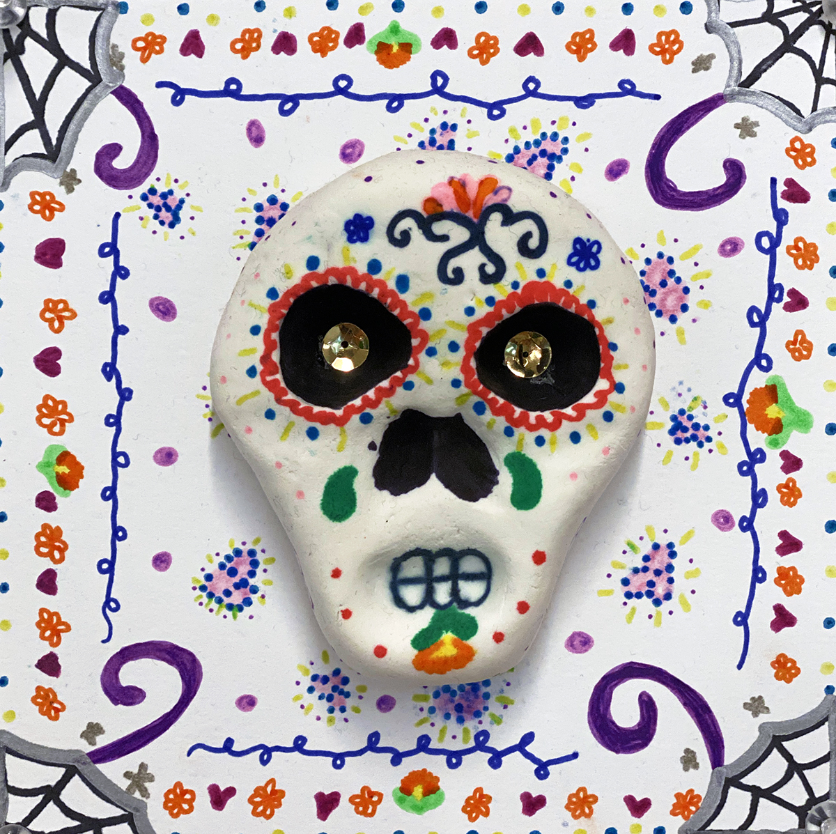 Students crafted their own skulls out of model magic. They were shown techniques for shaping the skull. Students then used sharpies to design the skull’s features, inspiring their designs from the icing designs on actual sugar skulls. To give the work a boost of color so prevalent in the celebrations for Día de los Muertos, students designed a patterned background to set the skull on, embellishing with glitter, because—why not?