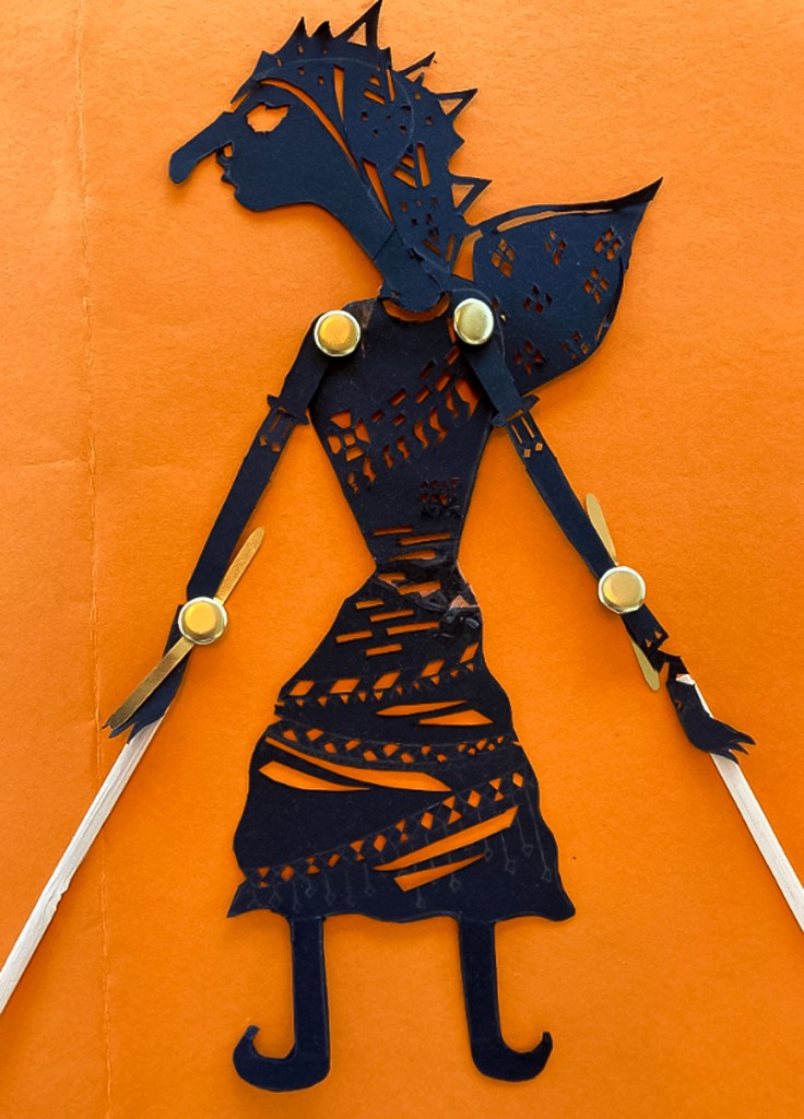 The following are examples of 8th grade students’ Wayang Kulit-style puppets. My apologies if some of these photos are out of focus. Some of these puppets were completed on campus, but others were completed while students were distance-learning during the pandemic, and sometimes their images are a bit fuzzy.