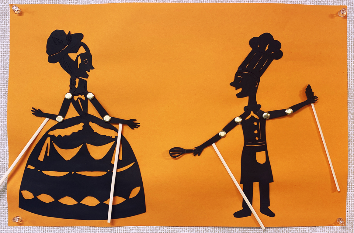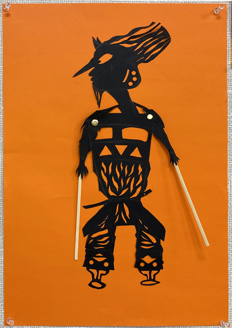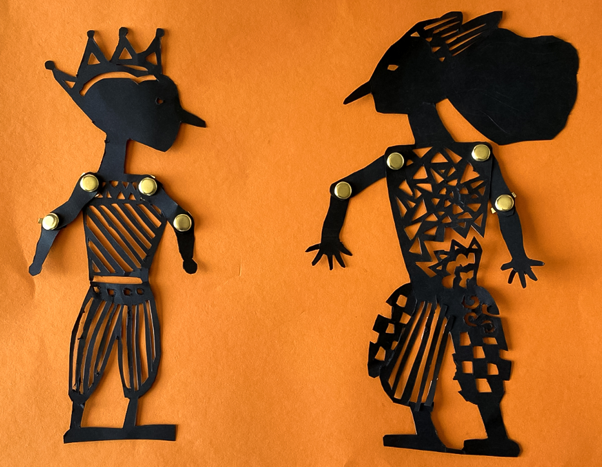 Students will attempt to recreate the same sense of the ornate, of the decorative, by using black card stock to perforate their own patterns and designs. They will not actually be placing these against a backlit screen; instead, we will use orange or yellow paper to pretend the puppets are being backlit and better see the perforated designs. They will also echo the disproportionate length and slim silhouette of the arms, using brass fasteners to create joints at the elbow and shoulder. Most students create two puppets as a way of imagining an interaction between the two.
