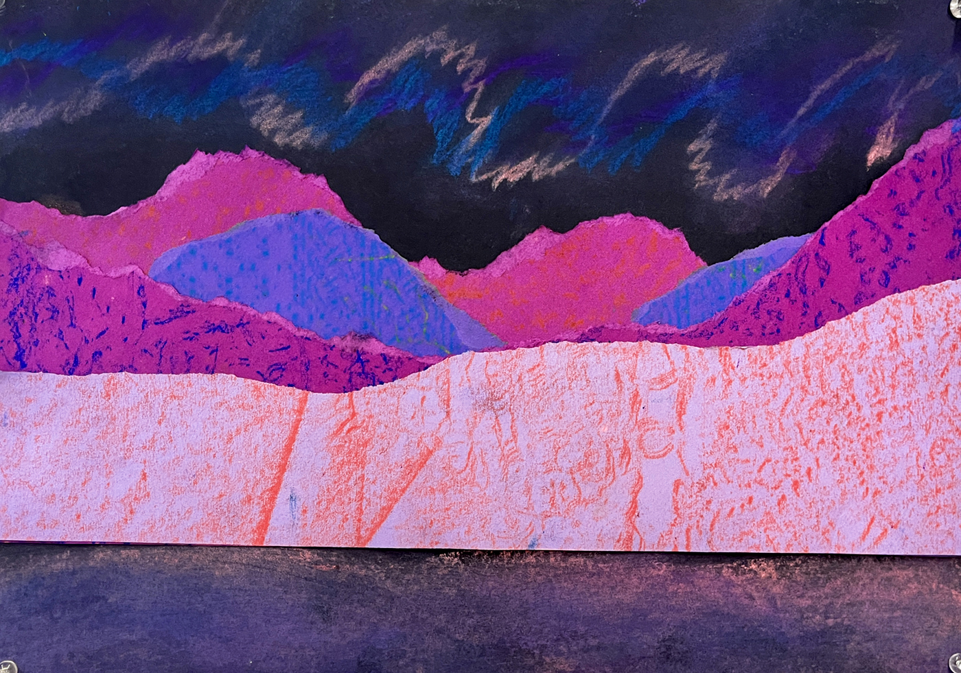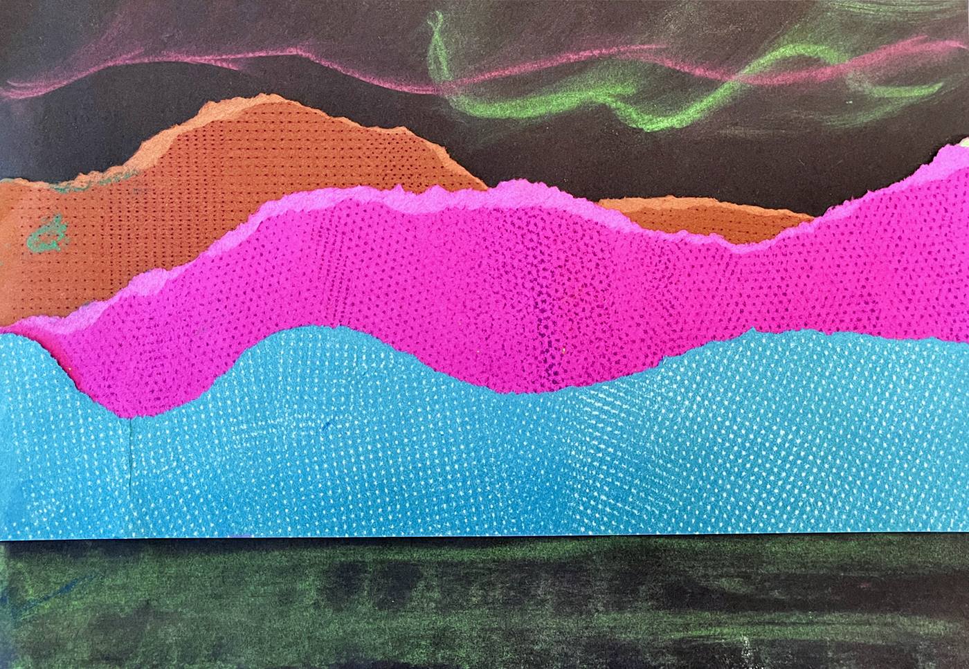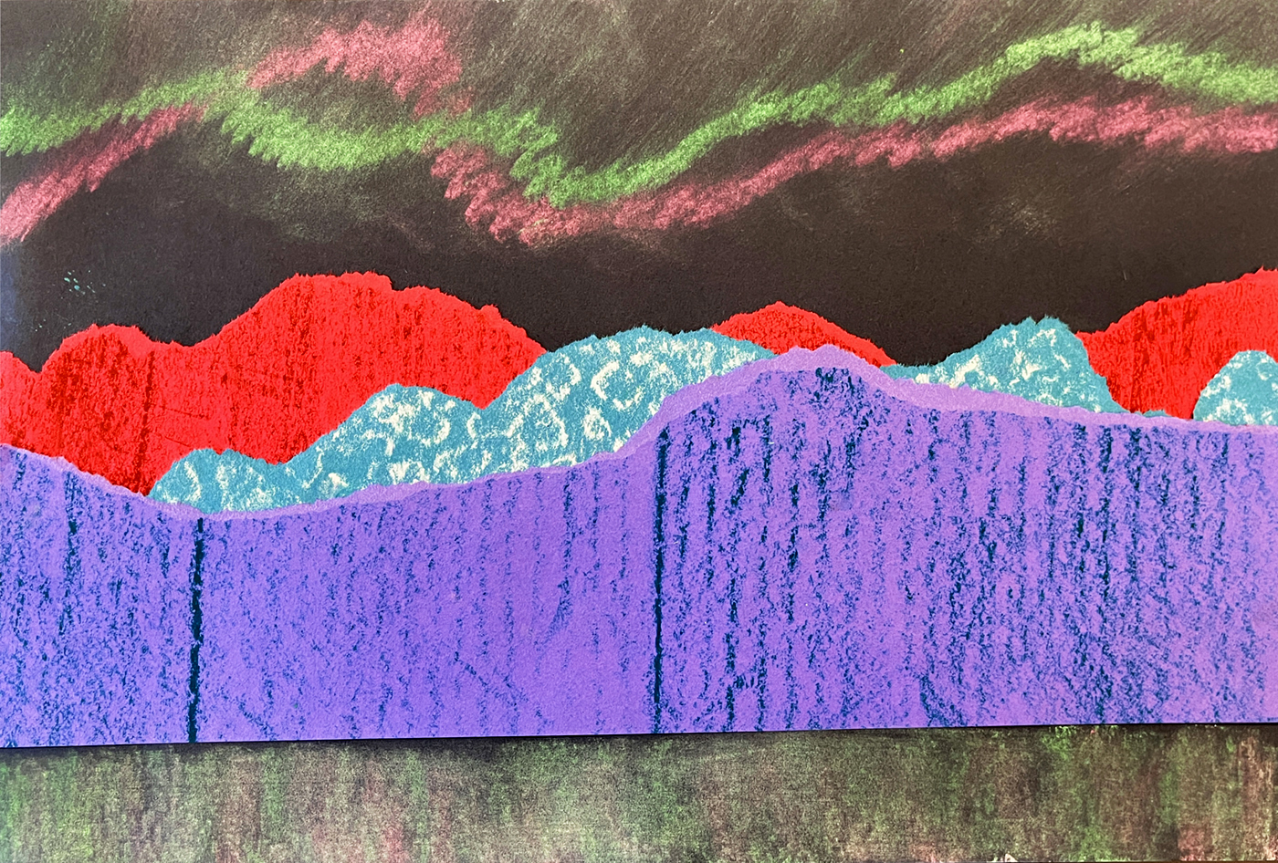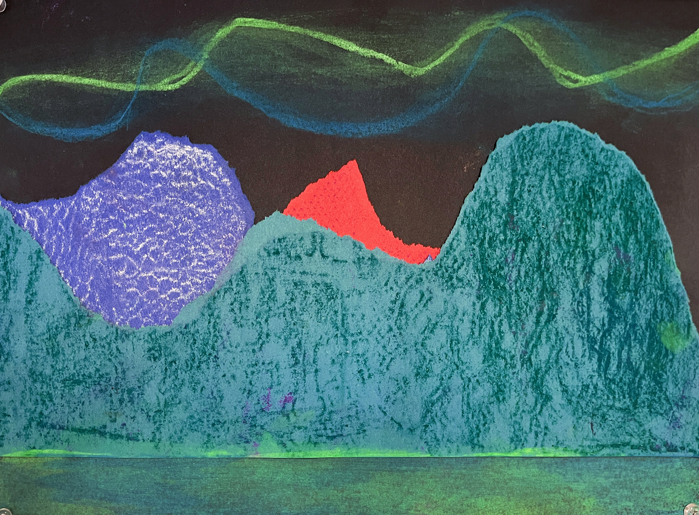 To coalesce students’ understanding of texture, they create a mountainous landscape that features the northern lights above, and a smooth, glassy lake below. The northern lights and lake highlight smooth textures, while the mountains highlight rough textures, as they are colored in with rubbing templates and the paper torn into coarse edges.