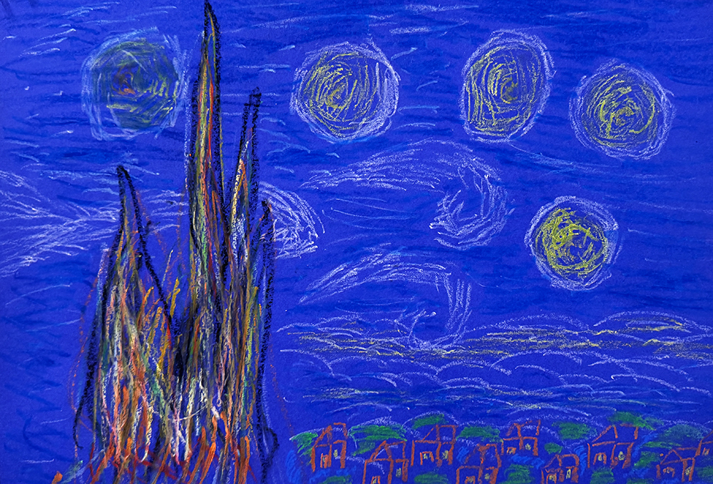 Description of the Unit – Students observed and discussed Vincent van Gogh’s famous painting, Starry Night, and, using what they noticed in the painting regarding color, texture and movement, attempted to recreate it in oil pastel.