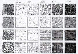 A chart depicting a variety of lines, including scribbling, stippling, hatching and cross-hatching, used in drawing to express texture and value.