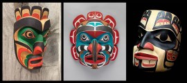 From l-r: Mask depicting Komokwa, Chief of the Sea, (Kwakwaka’wakw) by Jay Brabant c. 1987, cedar and paint; Mask also depicting Komokwa, c. 1980, by Lelooska, cedar and paint; All I know about the third mask is that it was carved by a Tlingit Indian of Alaska.