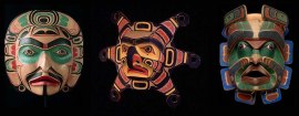 From l-r: Kwakiutl mask, cedar and paint; Kwakwaka’wakw, Richard Hunt, Mask Representing, Ancestral Sun, 1978, 50.5 x 58.0 x 20.0cm, red cedar, nylon twine, screws and paint; Xi´xa´niyus (Bob Harris, Kwakwaka´wakw, ca. 1900),’Kumukwamł (Chief of the undersea mask).