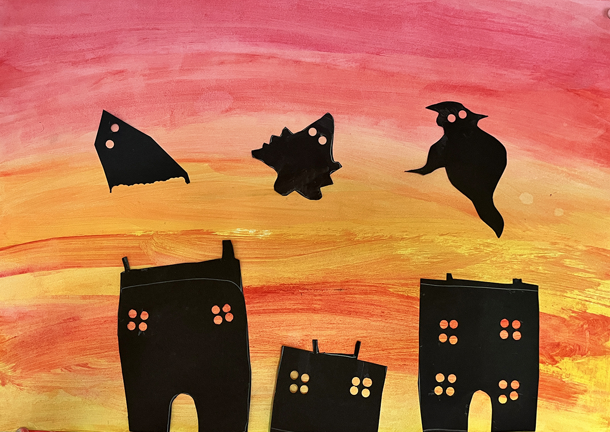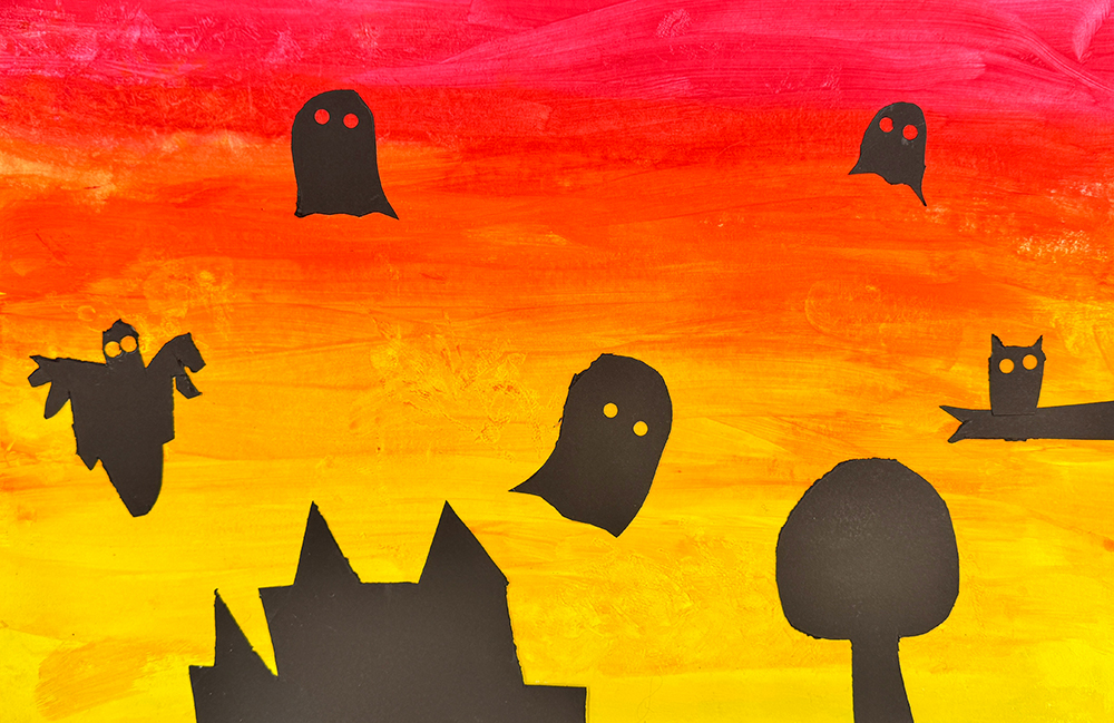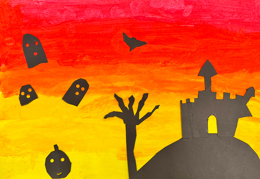 Activity statement – Ah, Halloween, my favorite annual celebration. My students also love Halloween, so to review shape and color, as well as to introduce them to positive and negative space, they will create a spooky scene in silhouette. Their “glowing” sunset background will help to reinforce their understanding of cool vs. warm colors, and how to create orange by combining red and yellow. This unit also supports the California Visual Arts Standards under Creative Expression: “Demonstrate beginning skill in the use of tools and processes, such as the use of scissors, glue, and paper” (2.2). Additionally, the unit supports deriving meaning via the discussion of works of art created in the classroom, focusing on selected elements of art, in this case shape and color (4.1) I adapted this unit from a previous one I had taught in kindergarten. You can see it here: https://anitasagastegui.com/2020/06/29/kindergarten-halloween-shadow-puppets-inspired-by-wayang-kulit-puppets/