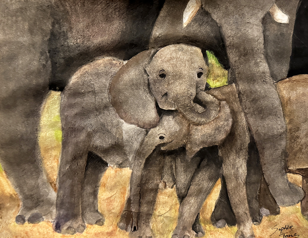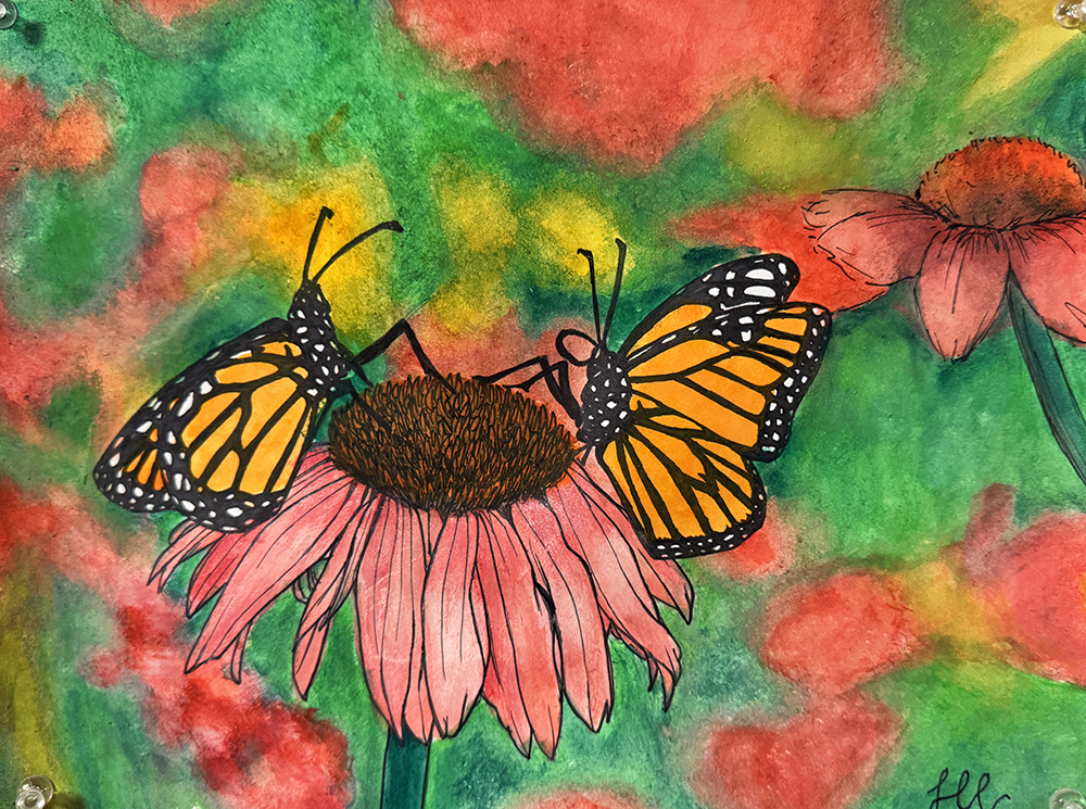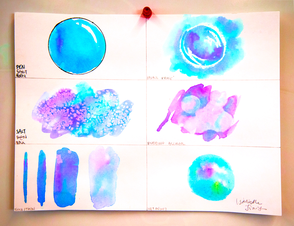 From here students then played with adding other media to watercolor, such as pen, crayon or oil pastel, salt and rubbing alcohol.