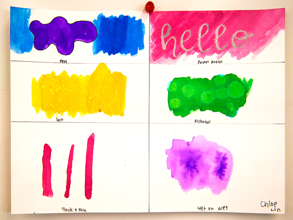 The students began with practicing the six basic watercolor techniques: