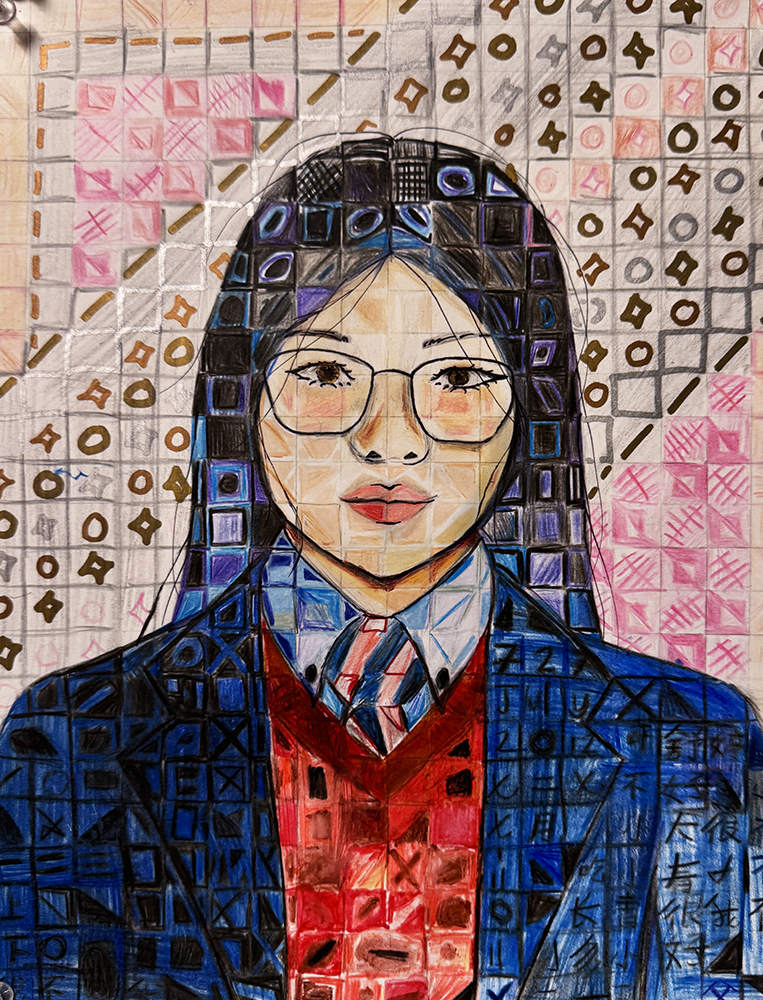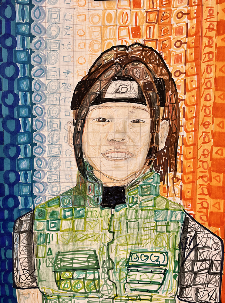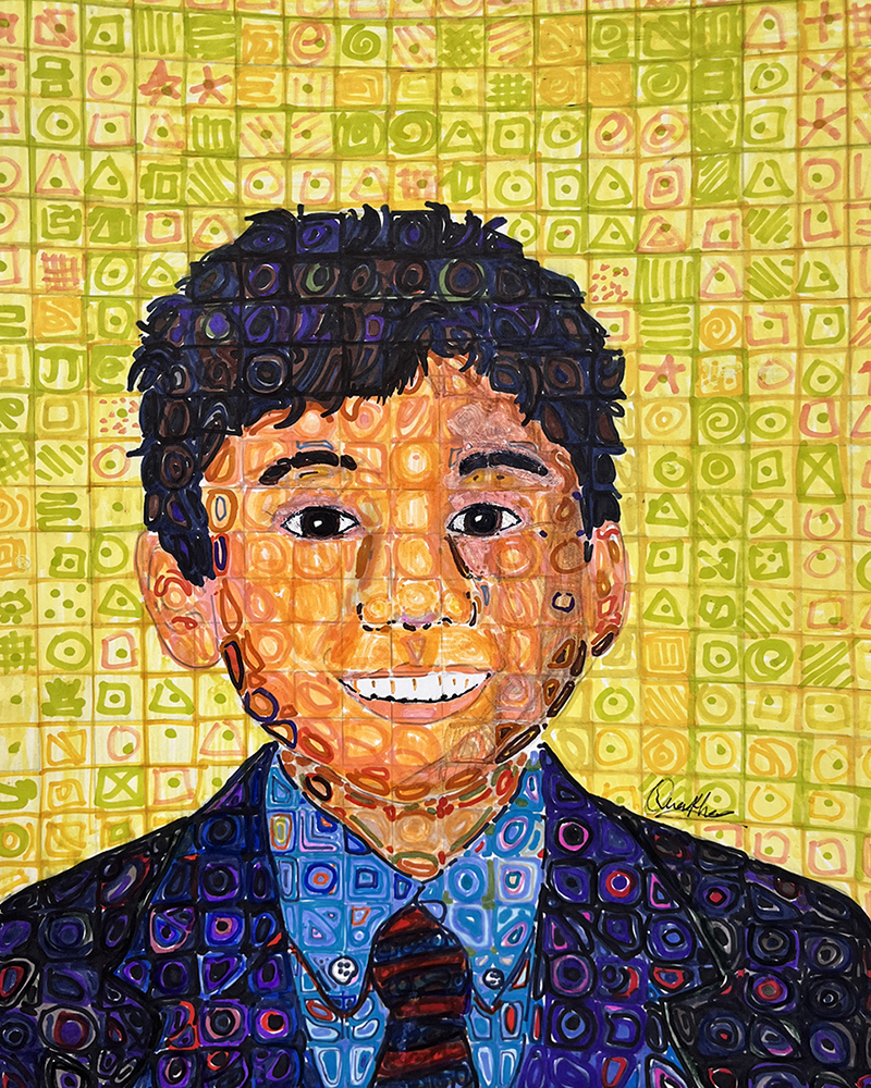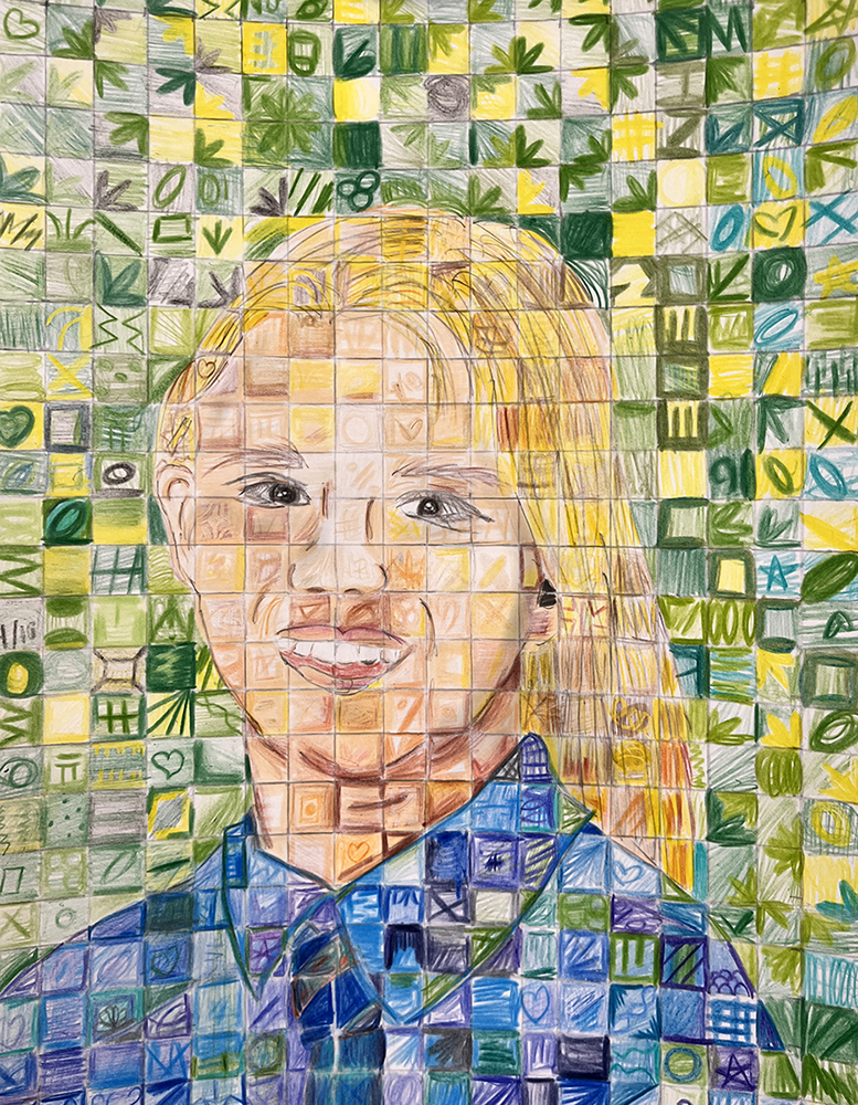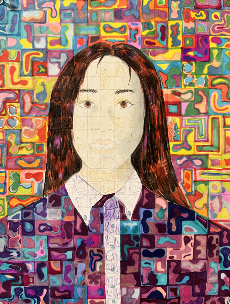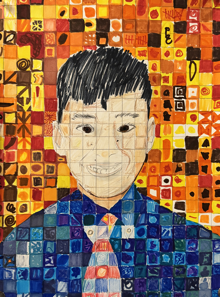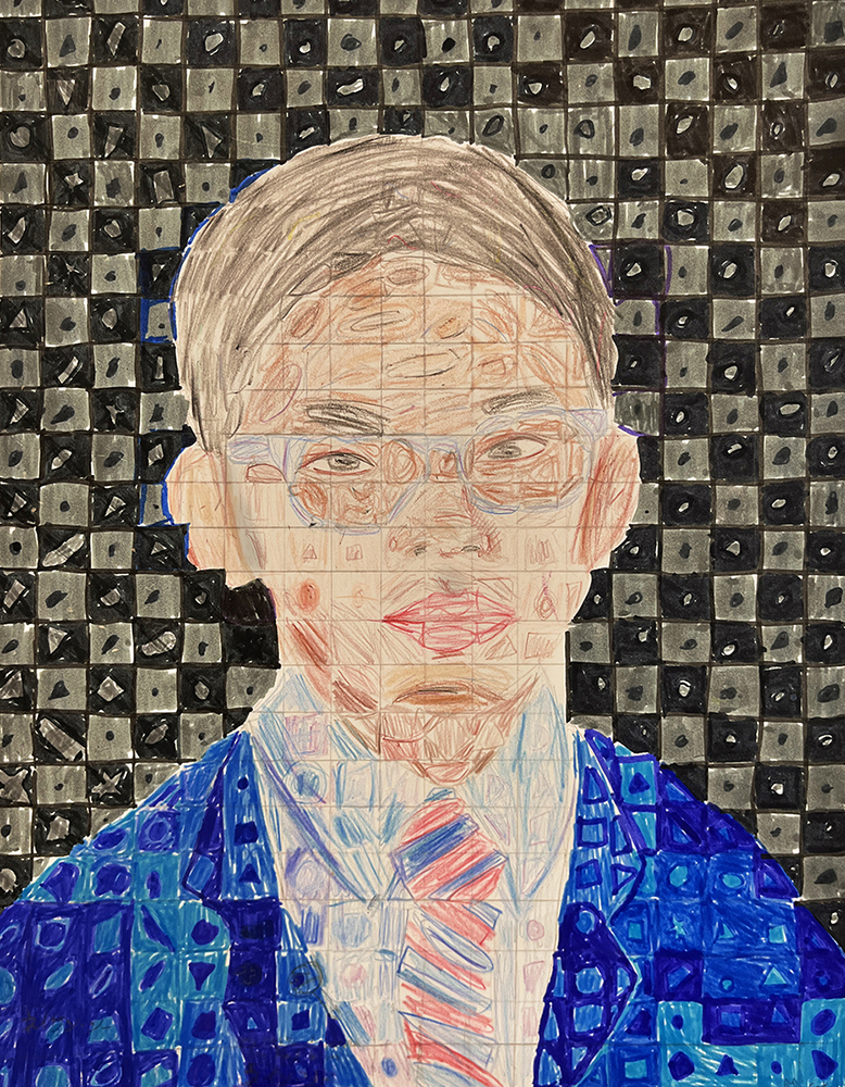 Activity statement – In 1988, a spinal blood clot left Close almost completely paralyzed and confined to a wheelchair. To keep painting, he devised a brush-holding device strapped to his wrist and forearm. It was then that he replaced the minute detail of his earlier paintings with a grid of tiles composed of abstract, organic shapes. Viewed up close, each tile is its own miniature abstract painting; seen from a distance, the tiles come together to form a whole portrait. After observing and discussing the characteristics of Close’s work, students took on the challenge of doing the same on a much smaller scale, using a self-portrait photo for reference. Of importance in this unit is for students to understand how to create tint, tone and shade, and how each contributes to express value, giving their portrait a three-dimensional expression while still being broken into a grid of individual shapes and colors.
